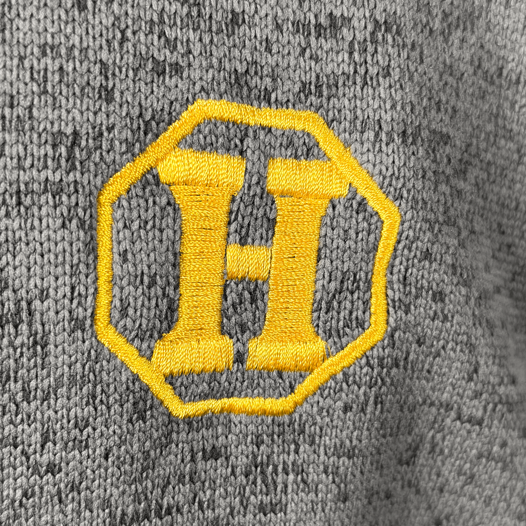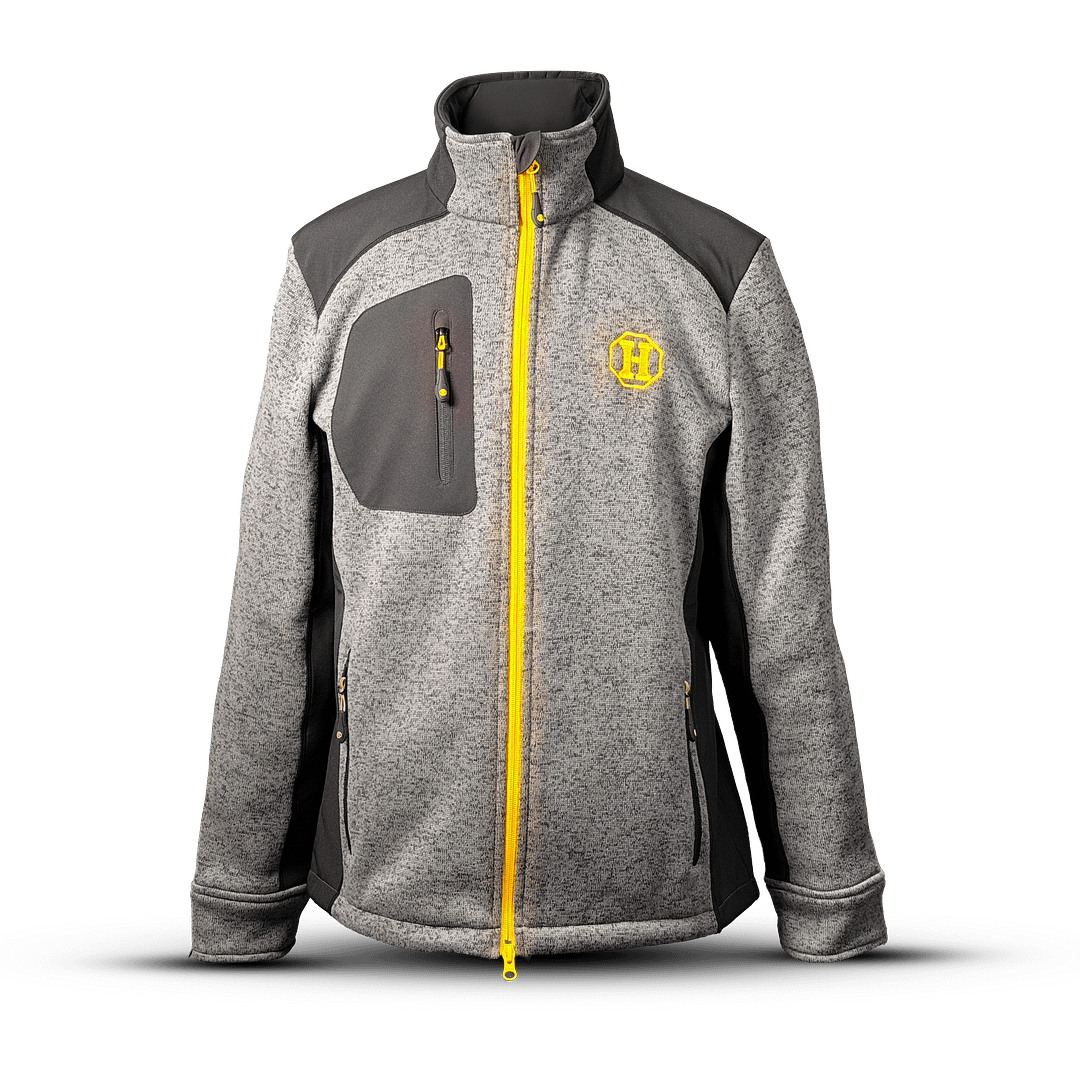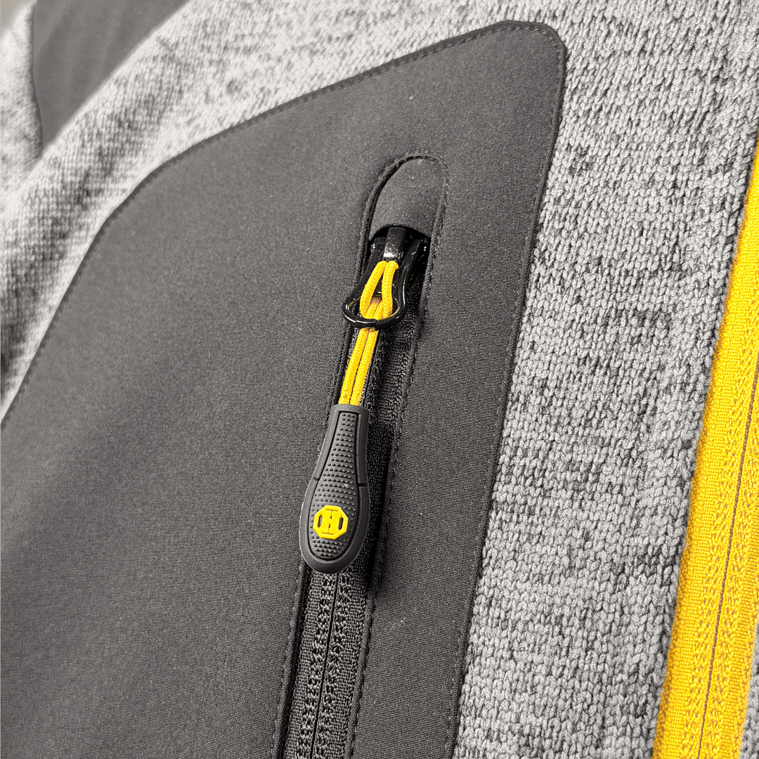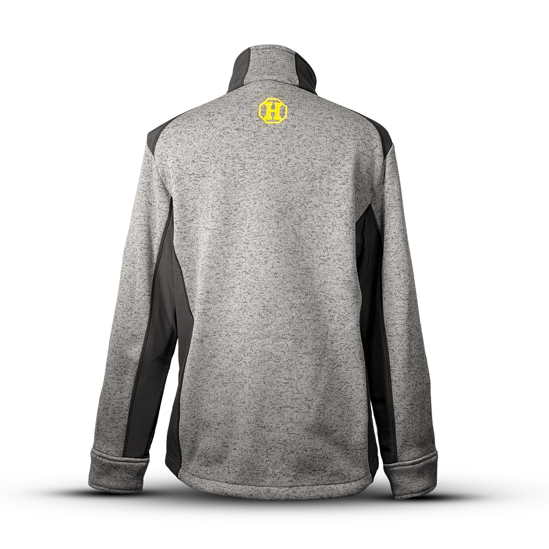Jakken er fremstillet i en strikket fleece i en lysere grå nuance, som giver et mere rent og tidssvarende look. De tidligere gule syninger er fjernet for et mere afdæmpet design, mens de nye H-logoer på brystet, armen og lynlåsene tilfører jakken et markant og eksklusivt Hydrema-udtryk. I nakken fuldendes designet af det klassiske Hydrema-logo.