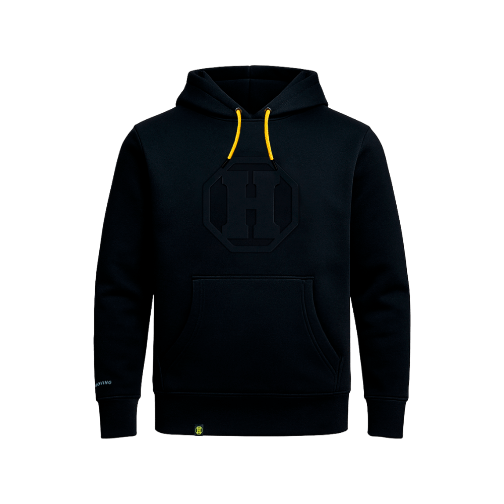 Designet har en justérbar hætte med gule snører, en stor frontlomme og et ikonisk Hydrema H-logo med en iøjnefaldende 3D-effekt (embossed) midt på brystet. For at fuldende looket står der “Keeps You Moving” diskret ved håndleddet på højre arm – et statement, der understreger Hydremas engagement i kvalitet og innovation.